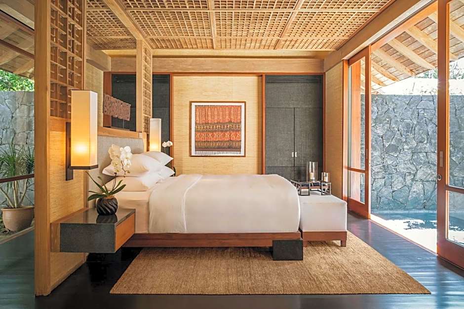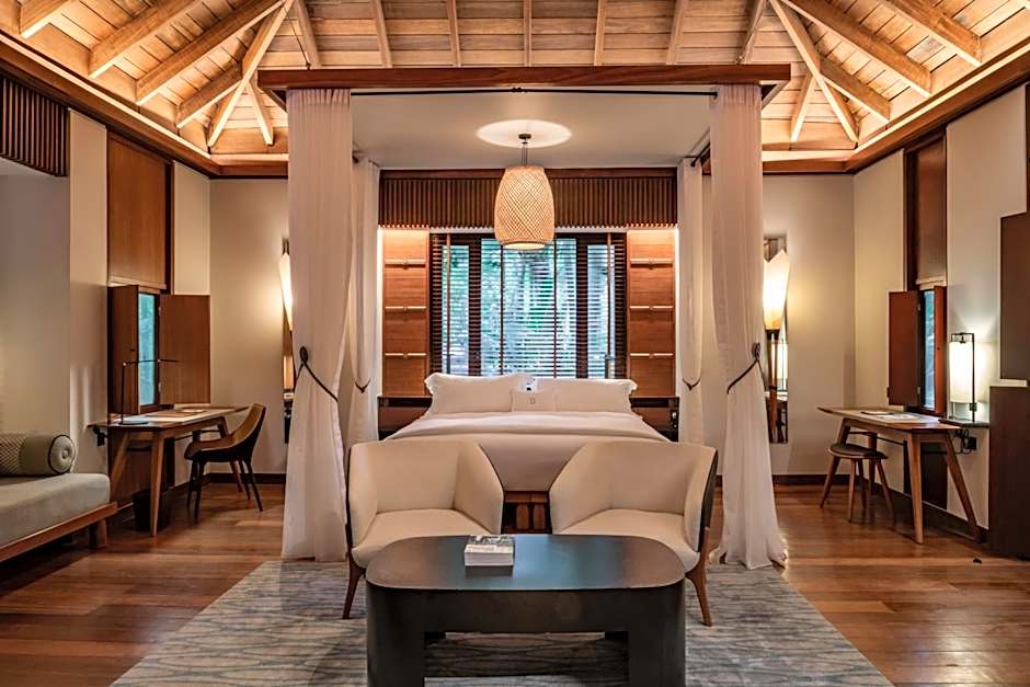 Enjoying views of the beach and sea, this spacious villa features a 10-yard private pool, a private tropical garden and outdoor rainshower. The separate living room is luxuriously decorated and has high wooden ceilings.